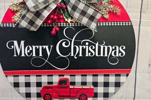 A Merry Christmas Door Hanger that won't break the bank. This wreath measures 12 inches across. The base is a thin wood product that has been painted and had vinyl applied. Above and below the vinyl Merry Christmas are appliques of ribbon and the whole holiday hanger is topped with a black and white buffalo check bow and greenery. The old red truck has become a Christmas classic so it just had to be included on this timeless piece. This item is light weight and easy to hang.