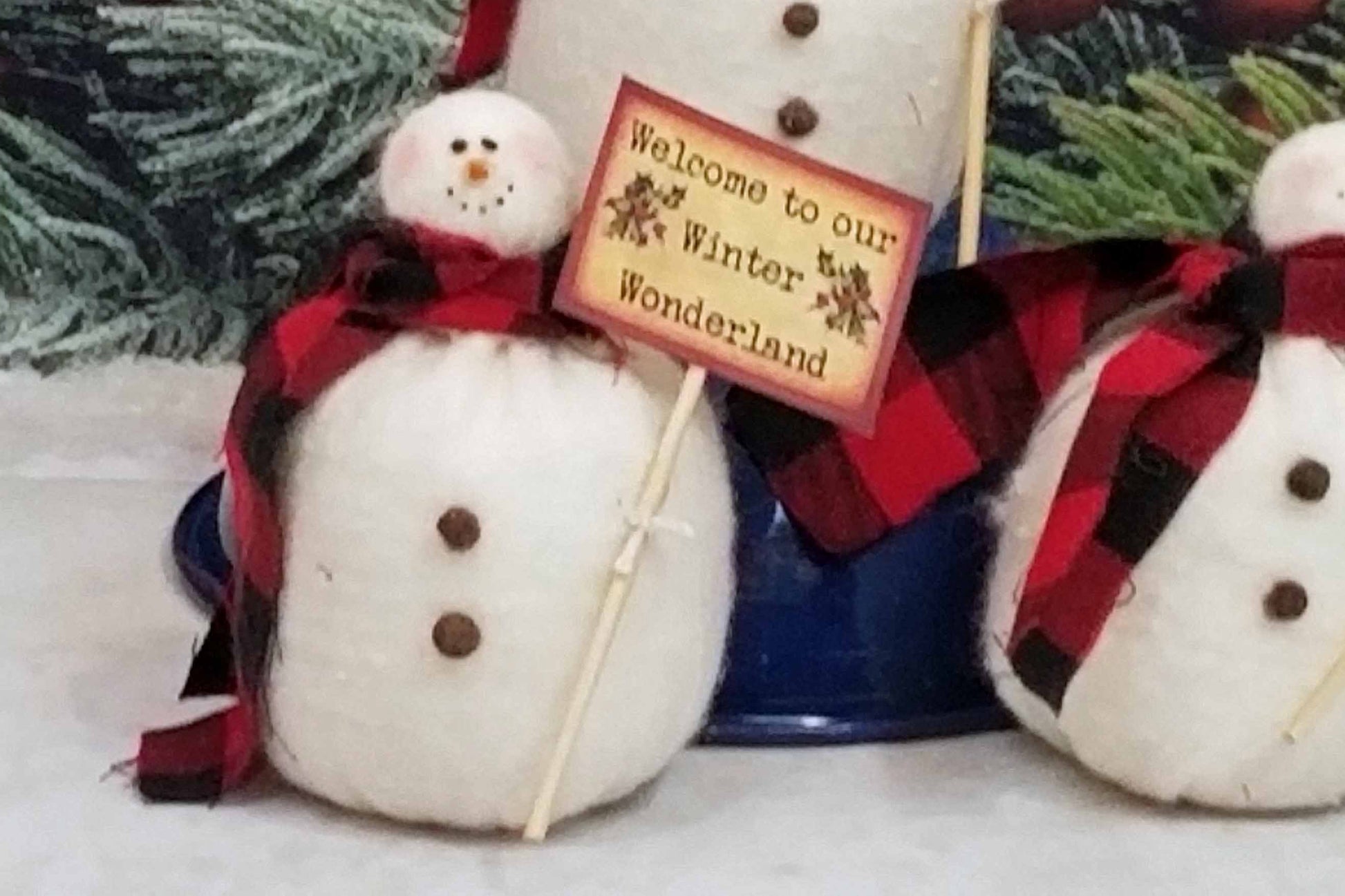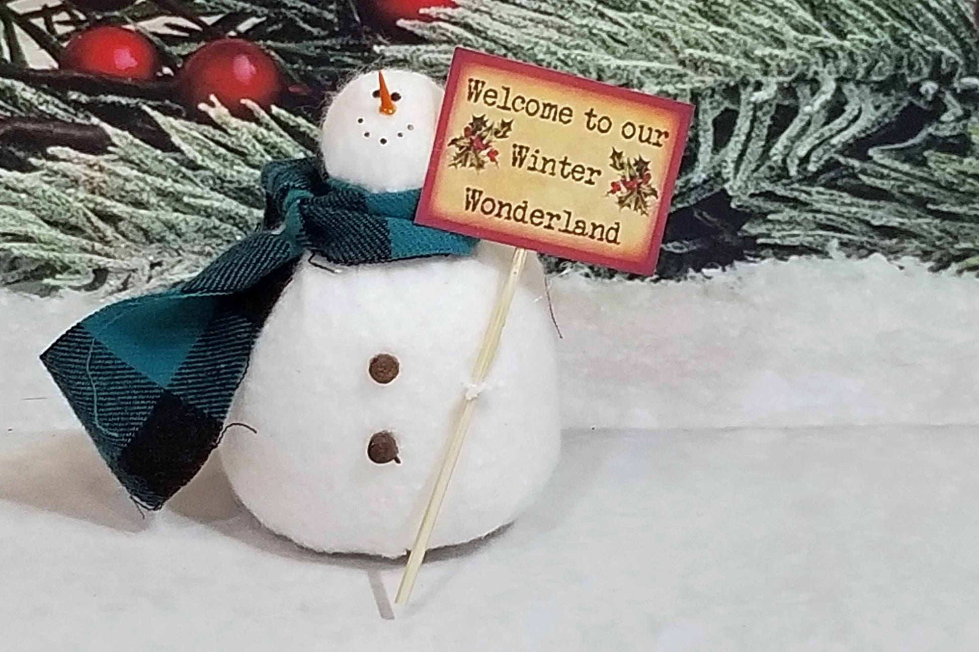 This precious little snowman is looking up at the world with a look of hope and joy on his face. His tiny painted toothpick nose is point towards the sky and he has sparkling painted eyes and mouth. He is made from a soft warm and natural batting and has a lovely homespun plaid scarf tied around his neck. He has allspice buttons running down his front. Tied to one side of his body is a small sign that reads "Welcome to Our Winter Wonderland".