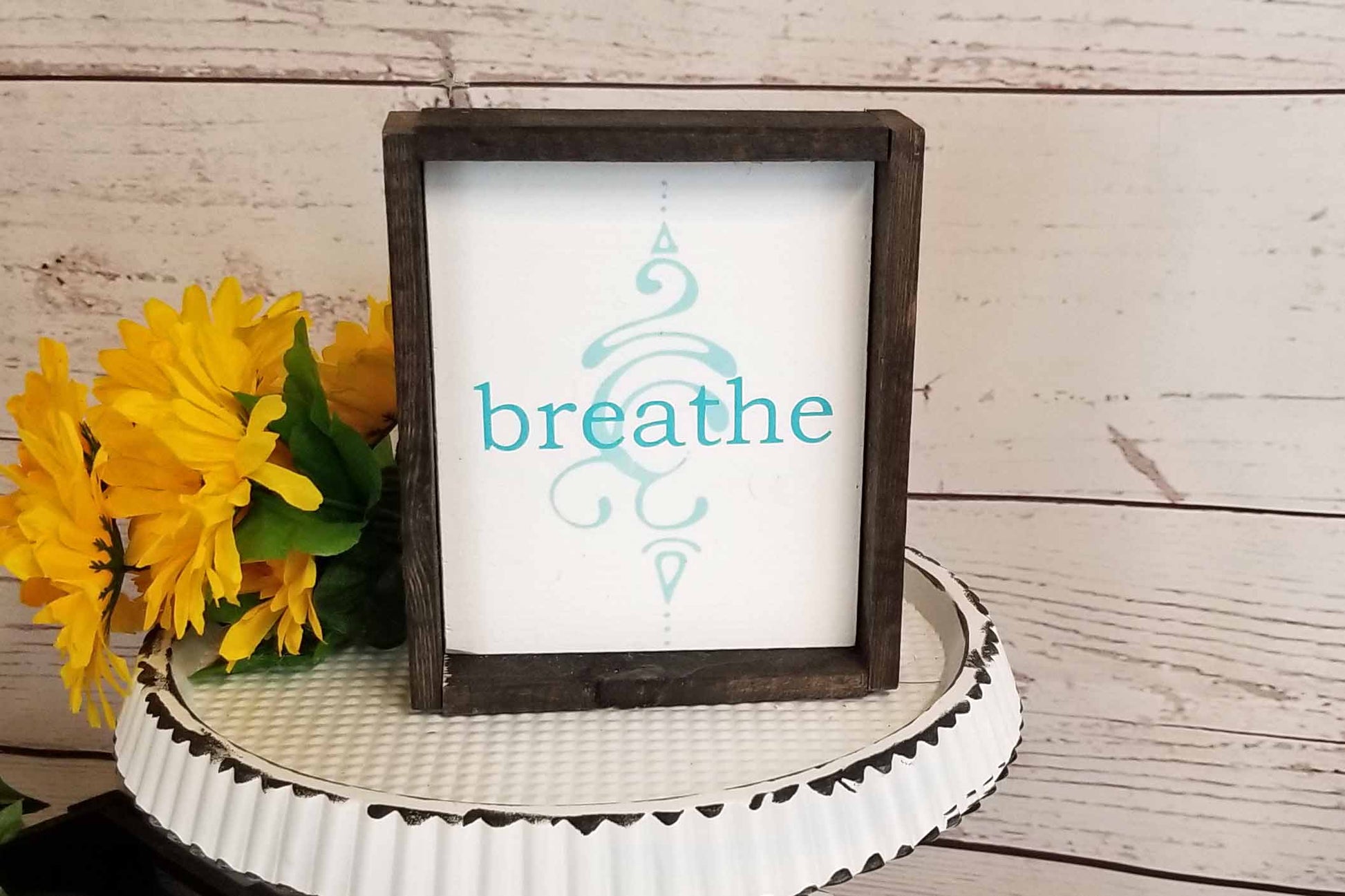 Simplistic, minimalist, spiritual, zen. All could describe this. "Breathe" That's it. Simple, right? But this is a message to inhale the positive, exhale the negative. This simple sign is uplifting with the light turquoise symbol in the background and the word Breathe in darker turquoise in the foreground. When you are looking for some inner strength. just breathe.