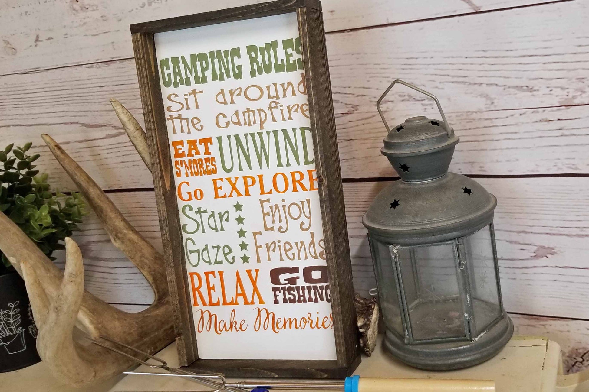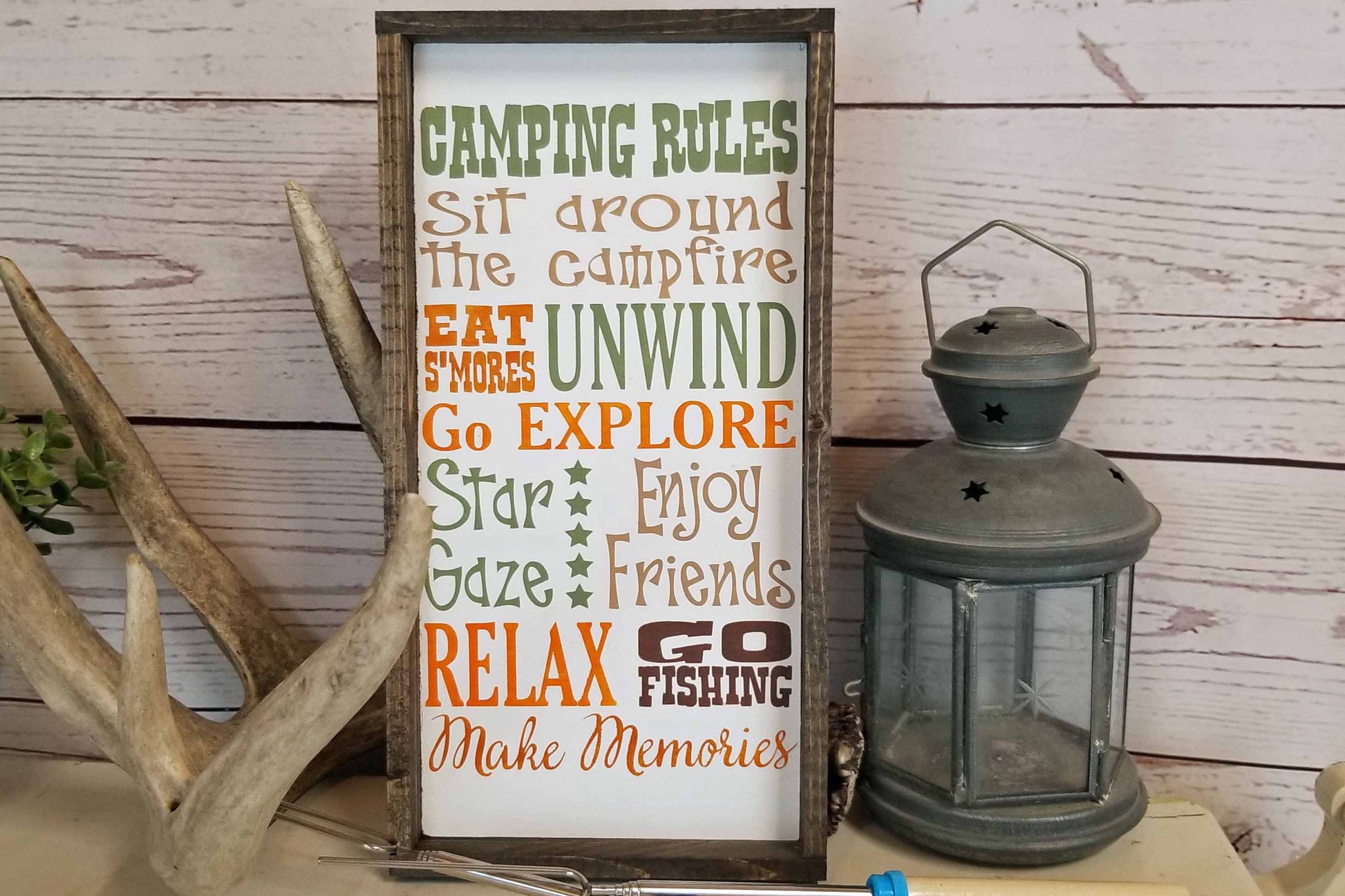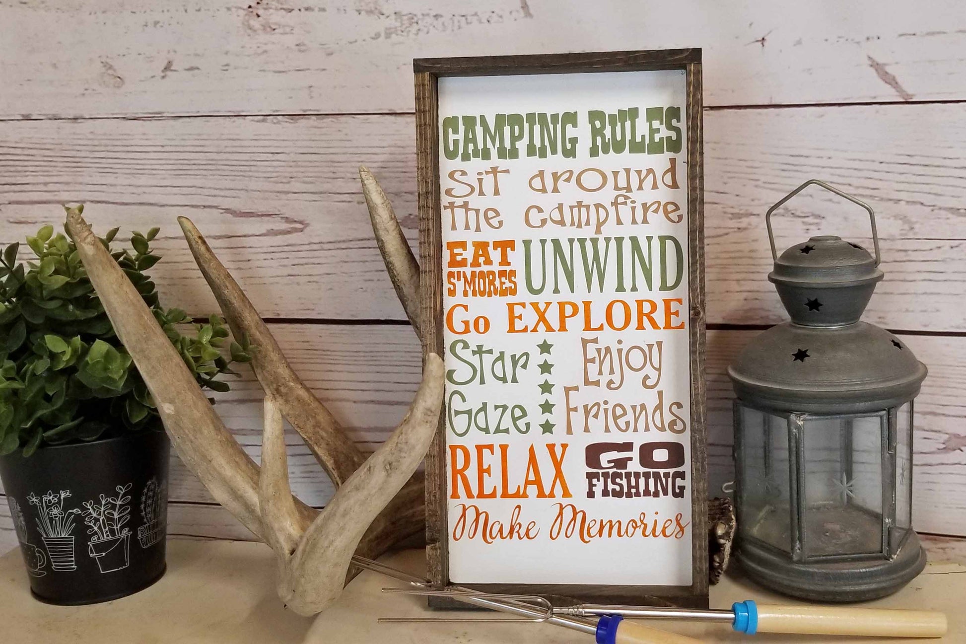 Camping Rules, Sit around the campfire. Eat s'mores. Unwind. Go explore. Star gaze. Enjoy friends. Relax. Go fishing. Make memories. All the best things about summer are summed up in this sign.