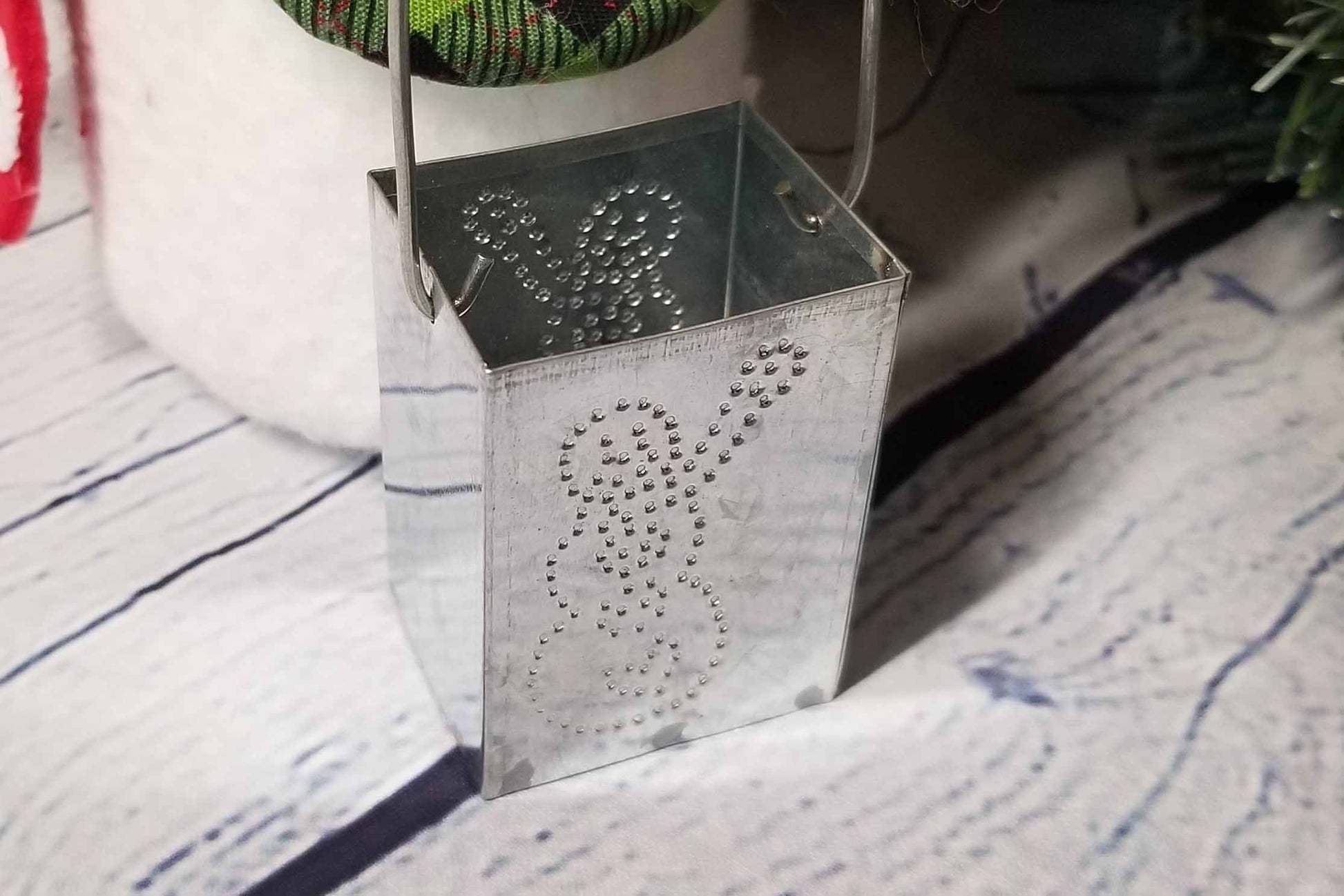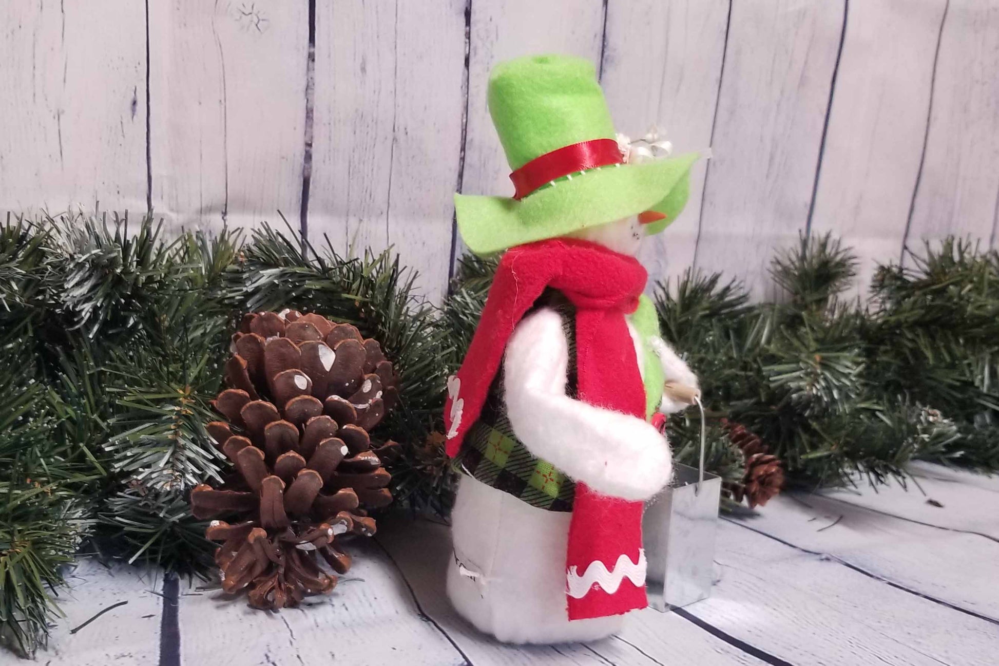 A cheerful, holiday snowman to brighten things up on a dreary day! This guy has a slight twist on traditional holiday colors, opting for a bright lime green instead of a more expected Christmas green. His vest is a lively green plaid and his top hat is green felt, set off with his red fleece scarf. He is hanging on to a stamped metal container. Maybe he is collecting snowballs...