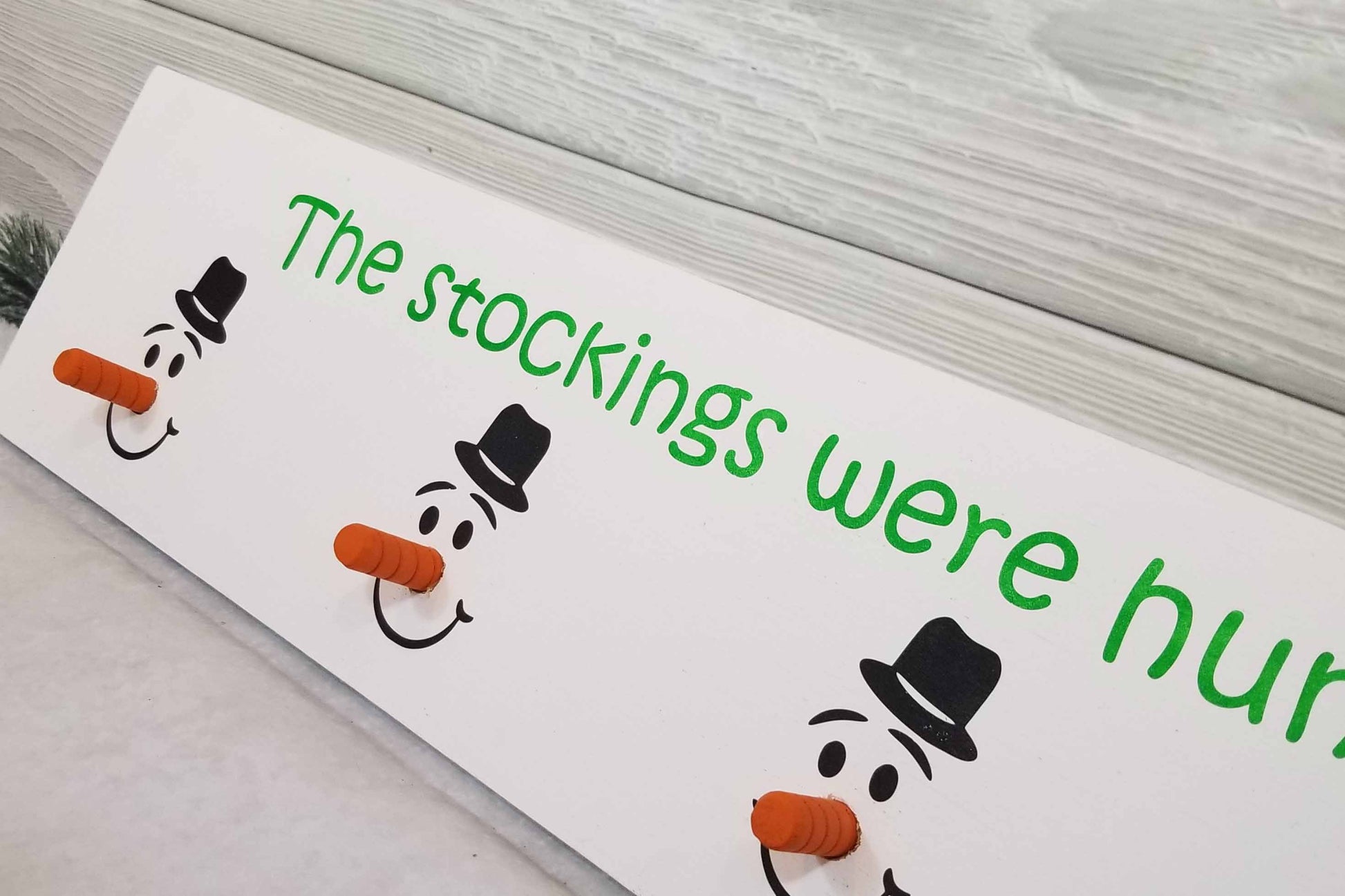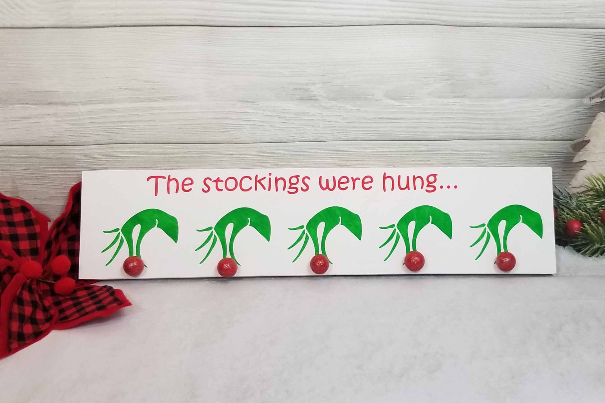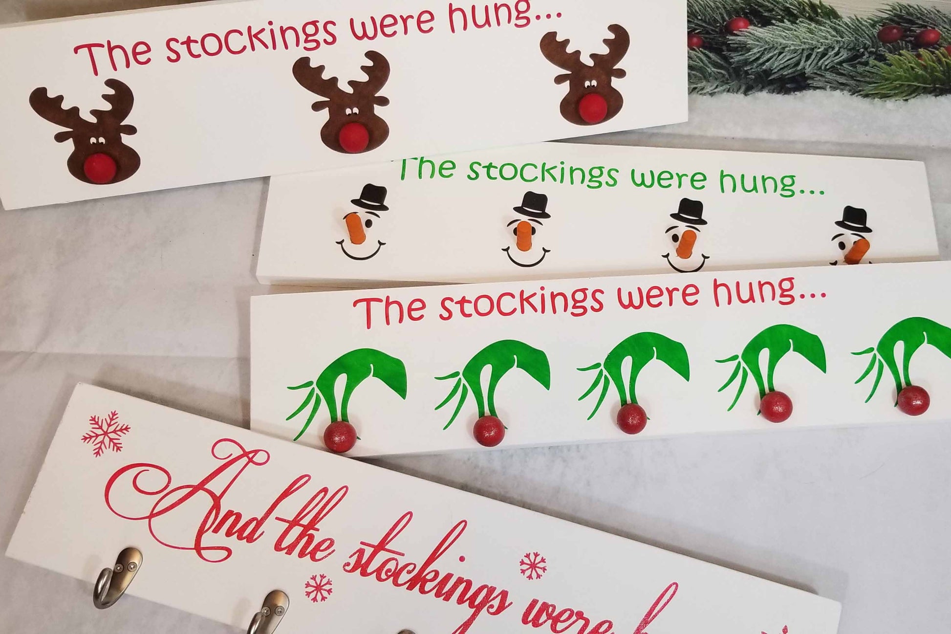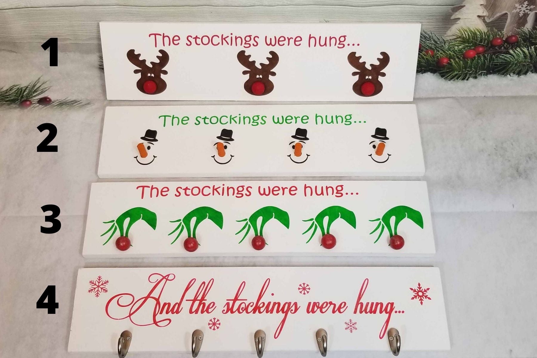 A cute and clever way to display your families Christmas stockings when you don't have a mantel. These stocking hangers are designed to hang on the wall from 2 saw tooth hangers mounted on the back. The reindeer noses and Grinch Christmas balls are wood balls that are screwed through the wood backing. Snowman noses are also made of wood and screwed directly through the wood backing. The hooks of the snowflake design are metal and securely attached to the wood with screws. This enables the stocking hangers to hold even a full stocking when Santa is generous.