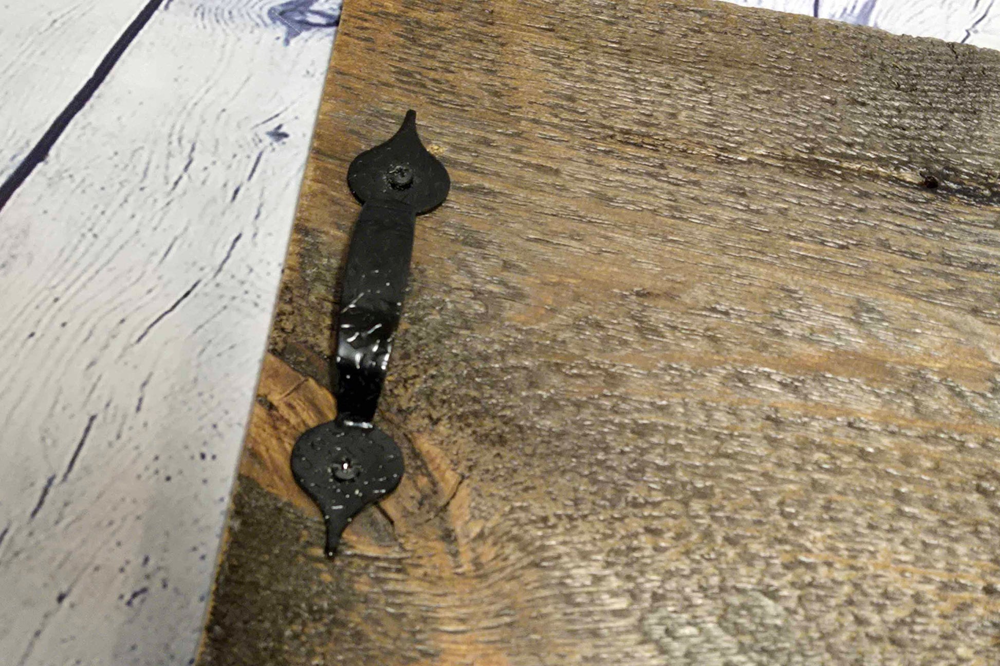 This item is a handcrafted, rustic-style wooden tray made from genuine 80 year old recycled barn wood and fitted with black metal handles, measuring 18 inches long by 9.5 inches wide. Its design highlights the unique, natural character of the salvaged materials, making it a versatile decorative and functional piece.