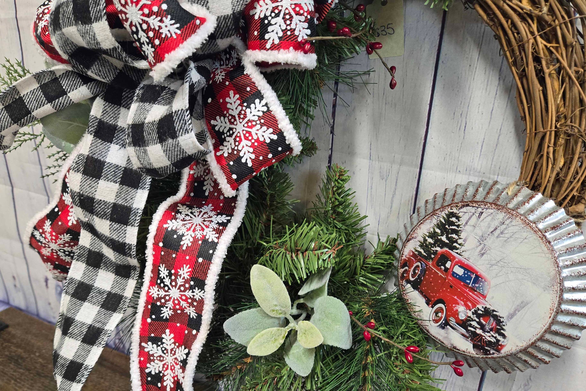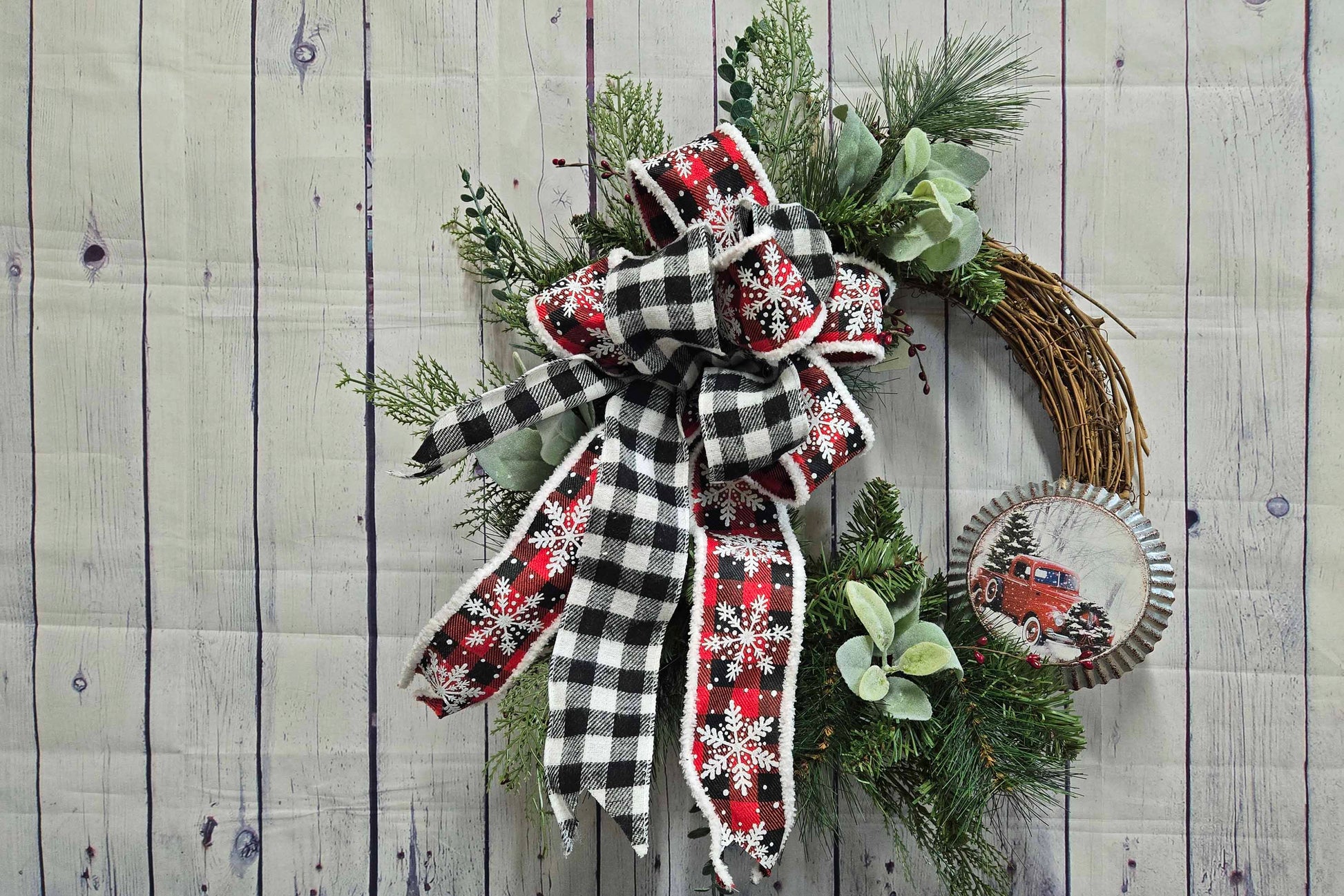 Welcome the holiday season with this beautiful, handcrafted farmhouse Christmas wreath. This rustic grapevine wreath features a classic black and white buffalo check bow, accented with red and white snowflake ribbon. The vintage red truck ornament adds a nostalgic touch of country charm, perfect for your front door under an overhang to protect from weather), mantle, or wall hanging.