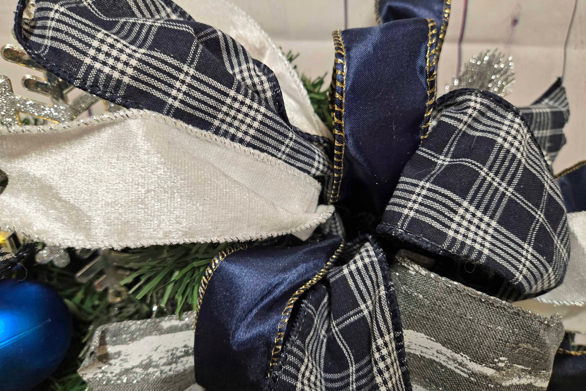This Christmas wreath will add just the right touch to your holiday decorating. Gnomes are so popular right now. And for good reason. They are adorable! This wreath lights up and is powered by 3 AA batteries (not included). The evergreen wreath measures 24 inches across and approximately 7 inches deep. I chose to use non traditional Christmas colors for this unique piece. There are multiple types of ribbon in navy blue, white and gray with just a hint of silver. The ribbon is highlighted with deep blue glittery balls. The focal point of this wreath is of course the 2 little gnomes that are perched amongst the greenery and the hand painted wood sign that reads "Gnome Sweet Gnome". This is a one of a kind. Get it before it is gone!
