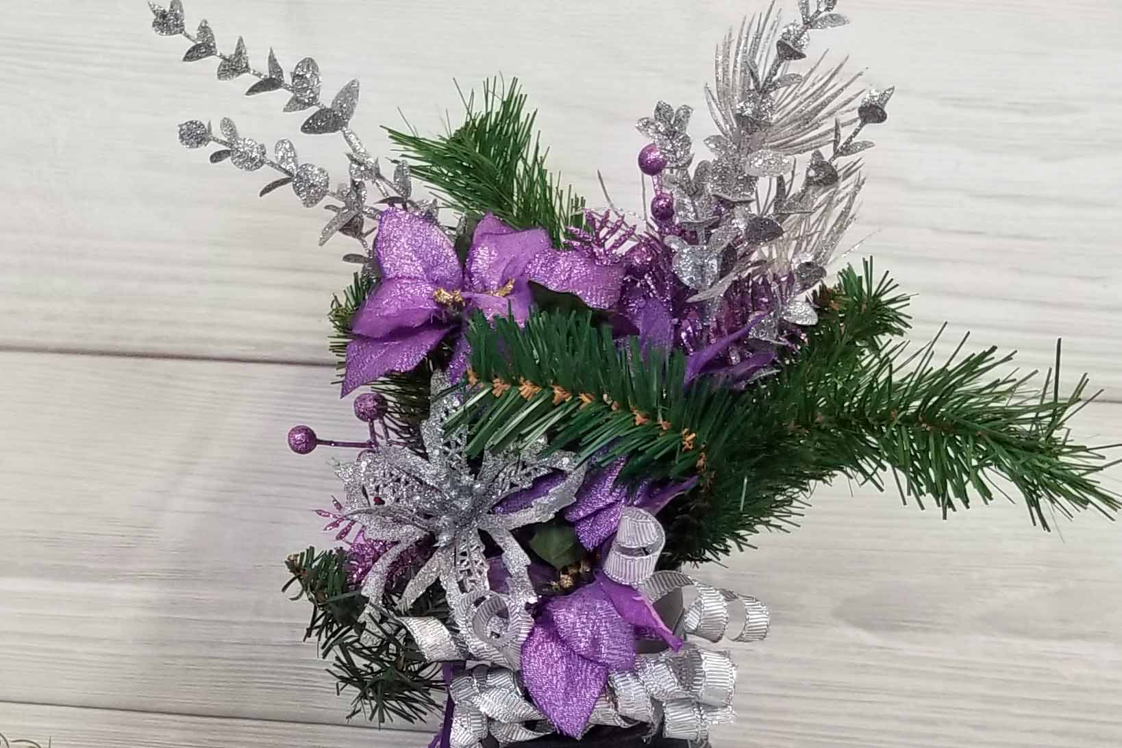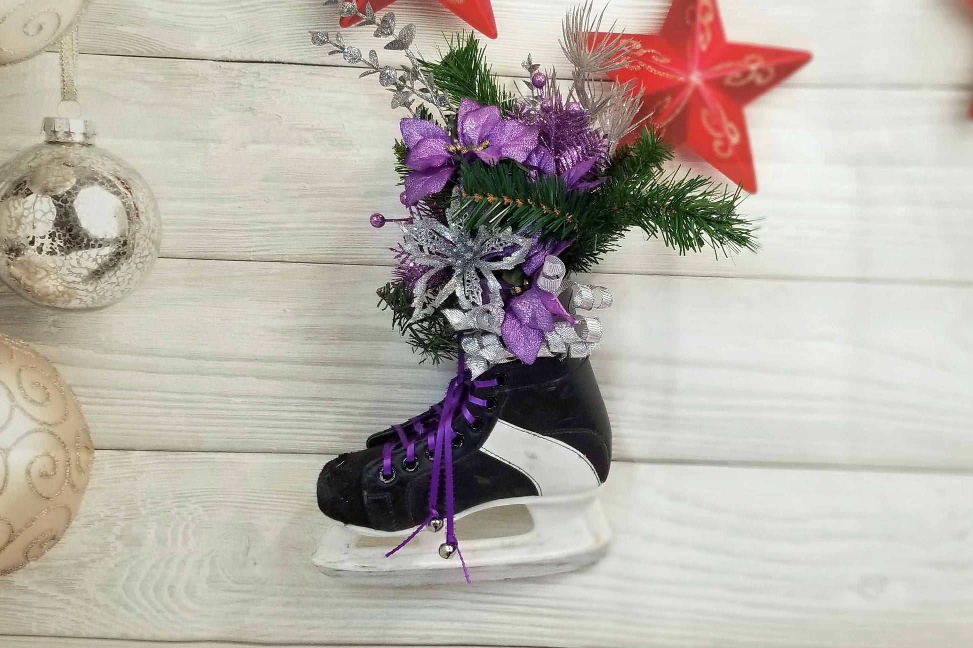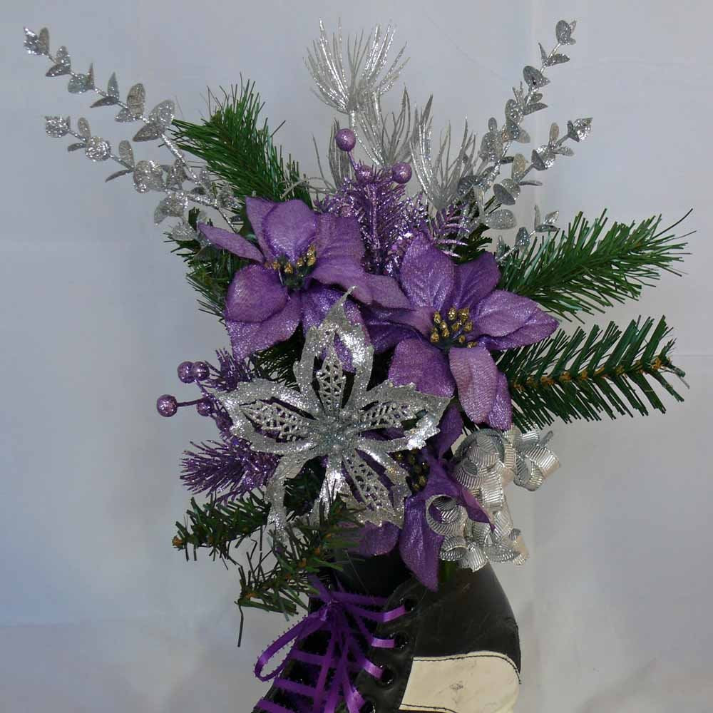 Skaters everywhere will appreciate this unique, one of a kind centerpiece. I have used an old, well used skate as the base of this centerpiece. The skate has a ribbon loop on the back side so that it can be hung on the wall like a wreath. It also comes with a wood base that the skate can be set into so that it can stand anywhere or act as a unique centerpiece. The skate has been laced with purple ribbon and silver bells and filled to overflowing with purple and silver poinsettias, greenery and sparkly silver accents.