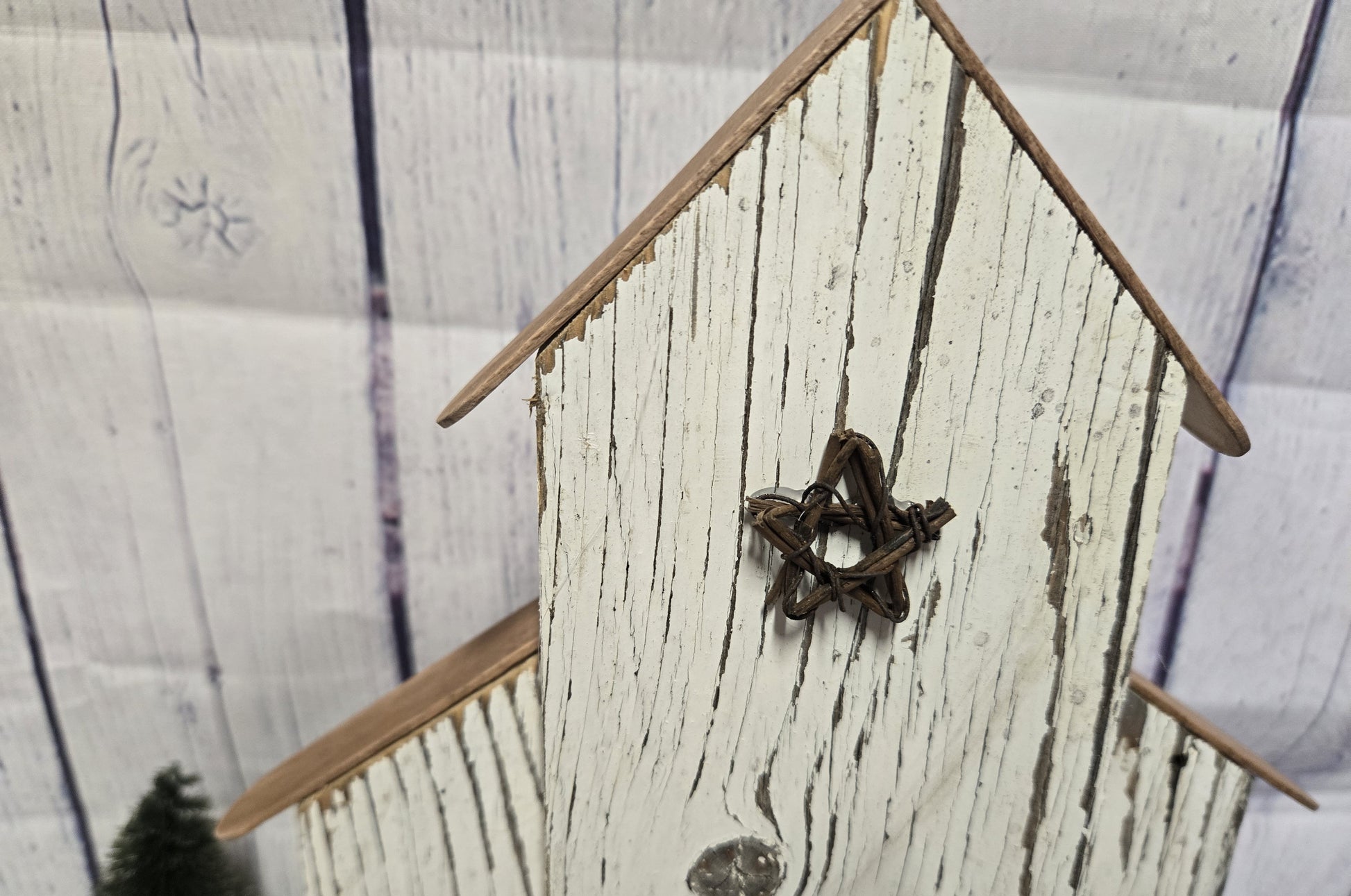 This handmade rustic wooden church is crafted from weathered, distressed wood for a charming farmhouse decor aesthetic. Perfect as a freestanding display piece, this white country chapel features a natural wood door and an antique-style star accent. It makes an ideal addition to your mantle, shelf, or as a thoughtful Christian housewarming gift.